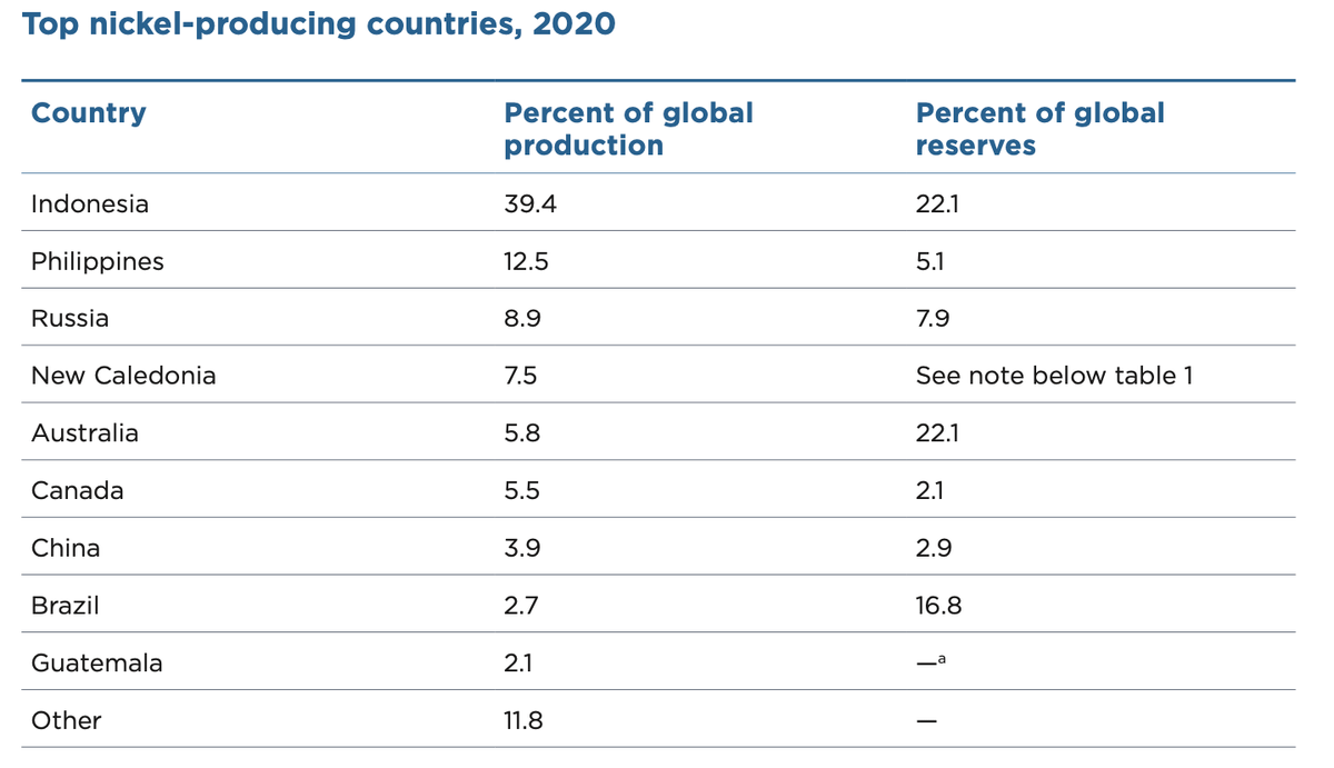 Nikl je hodně koncentrovaný do Indonésie (těží zahraniční společnosti). Na dalším místě jsou Filipíny (těží místní firma) a Rusko. Sídla těžebních společností těžících nikl jsou rozptýlenější a v tomto případě nemá Čína významný podíl na kontrole společností.