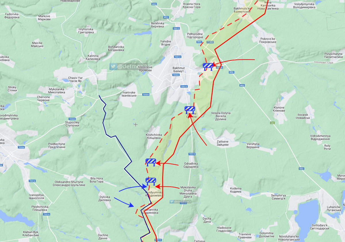 This is roughly what I think is going on around the city Bakhmut. Earlier in the week it was reported RU units managed to get in to the very eastern part of the residential areas of Bakhmut.