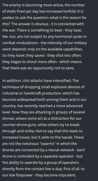 He also describes what can only be interpreted as Robot Wars. UA attacking with swarms of drones to distract their anti-drone drones.