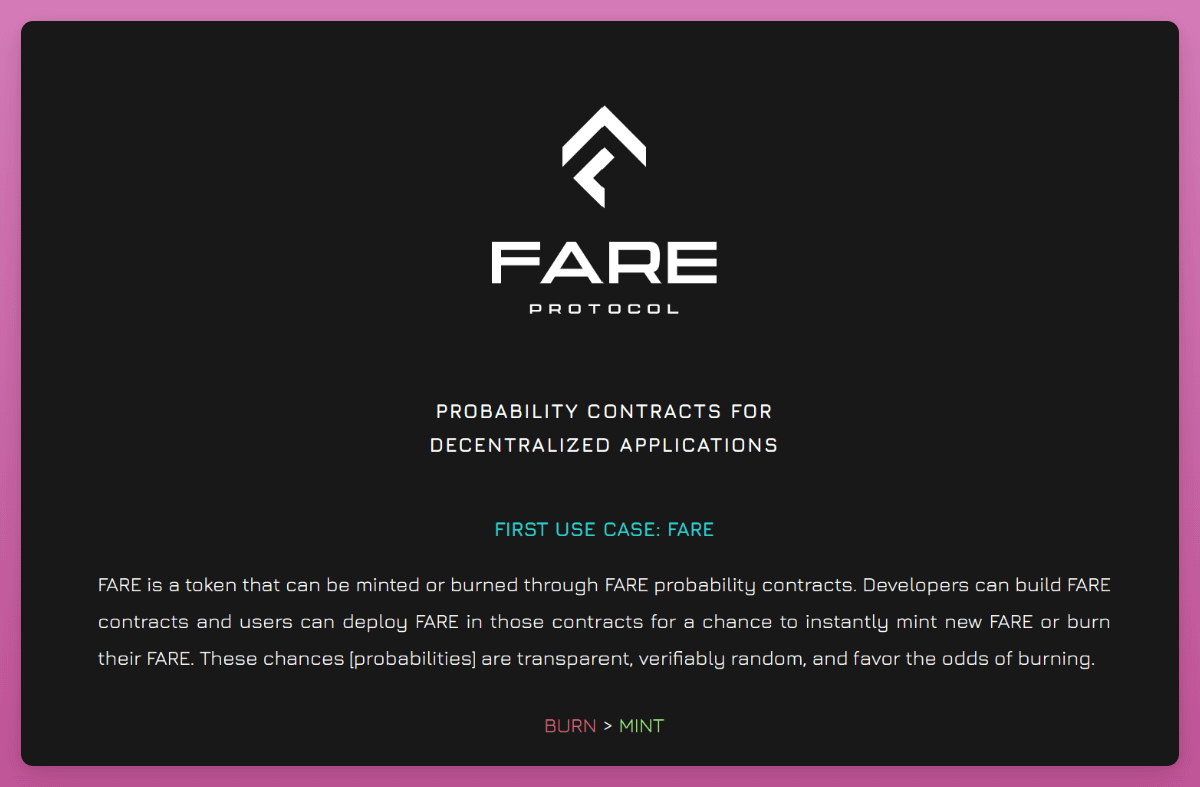 Its 'win or lose' system, akin to a casino, burns/mints FARE tokens based on transparent, on-chain probability events.