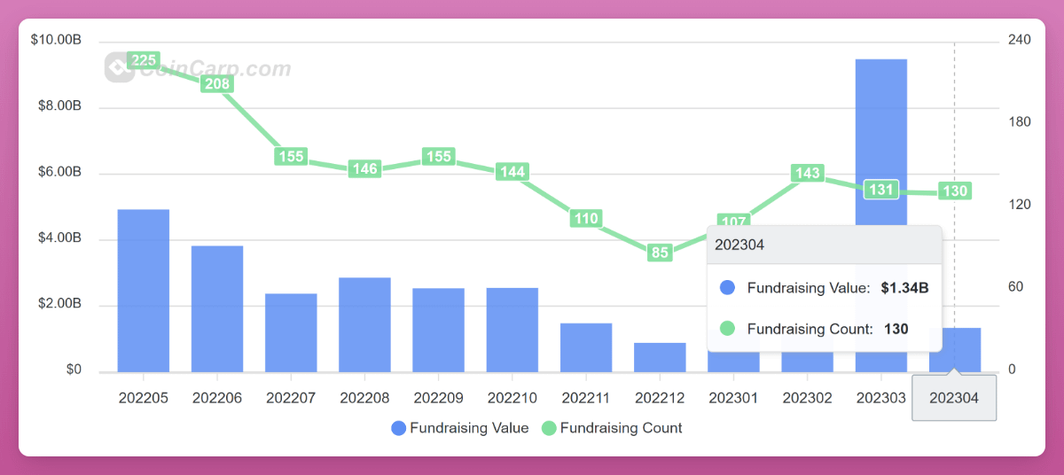 There were 130 crypto fundraising deals worth $1.34B in April.