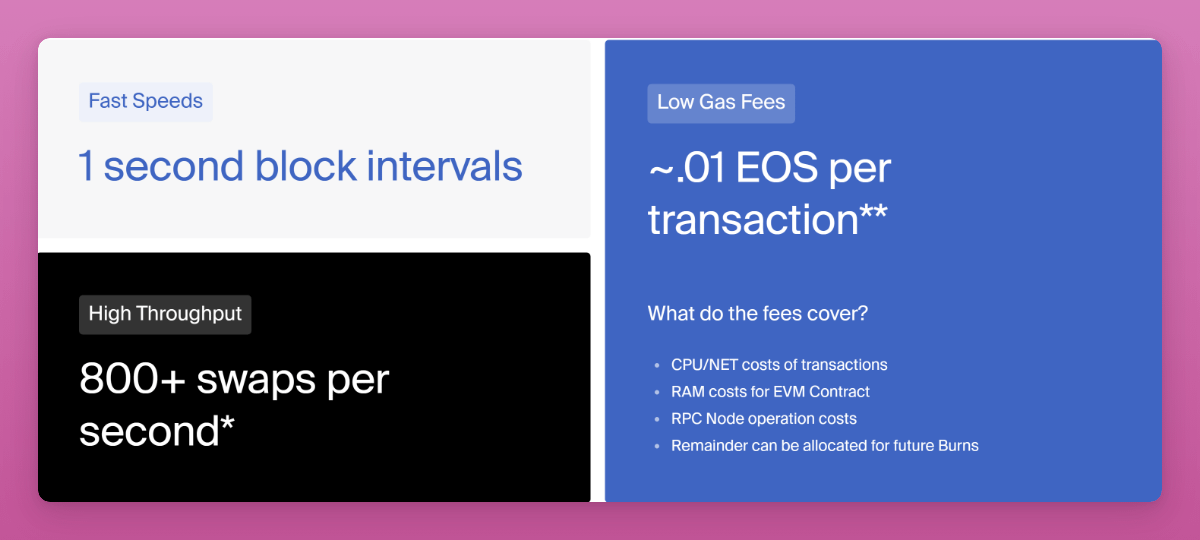 EOS EVM claims to be 25x faster than AVAX and 3x faster than Solana or Polygon.