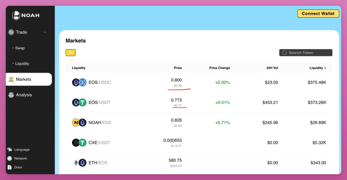 The majority of Noah's liquidity comes from EOS/USDC and EOS/USDT LP pools.
