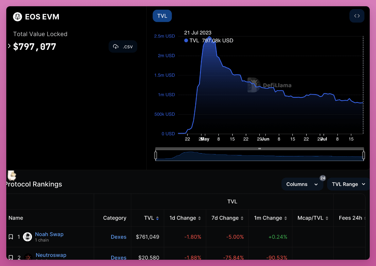 Also, 99% of that EOS TVL is tied up in one dApp—Noah Swap.