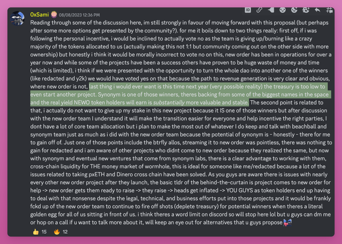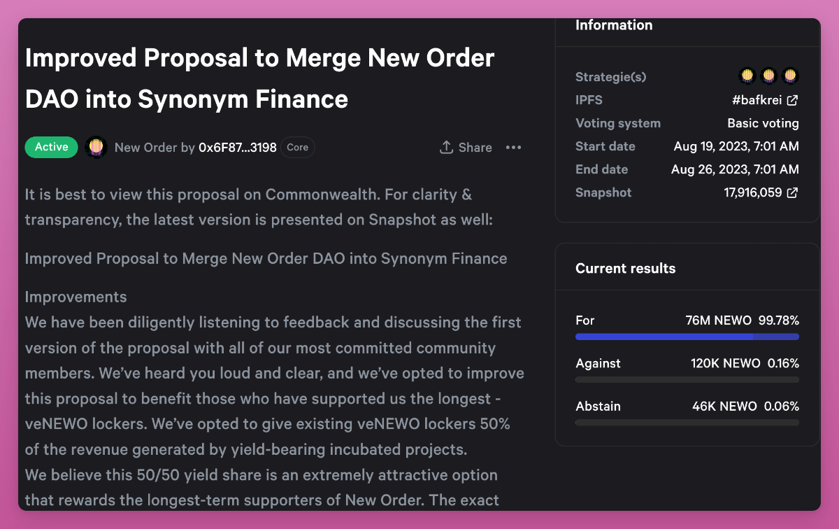 Thus, they proposed merging New Order DAO with Synonym Finance.