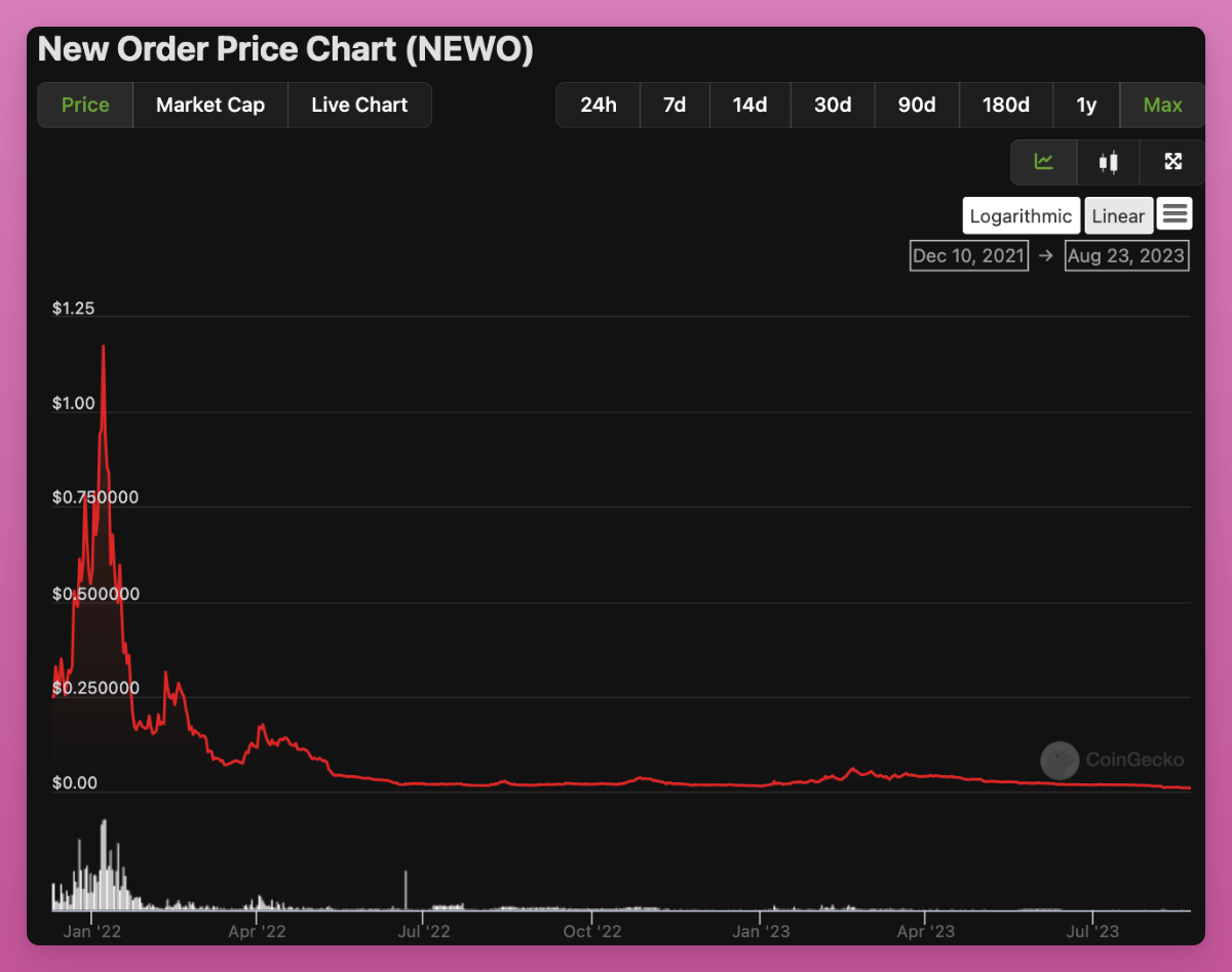 The $NEWO token looks like the majority of DeFi tokens, dropping by 99% from ATH to a current $1.8M market cap.