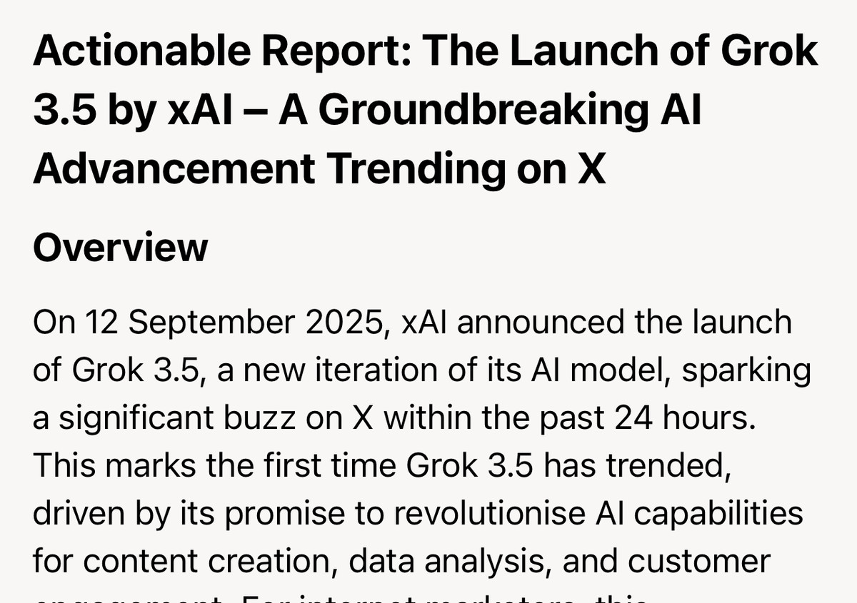 First, this is my regular warning to always fact check GenAI output. To me, this is obviously off. Grok did not release CreativeSpark, nor add real time sentiment analysis features yesterday, but the text reads convincingly, and cites industry publications.
