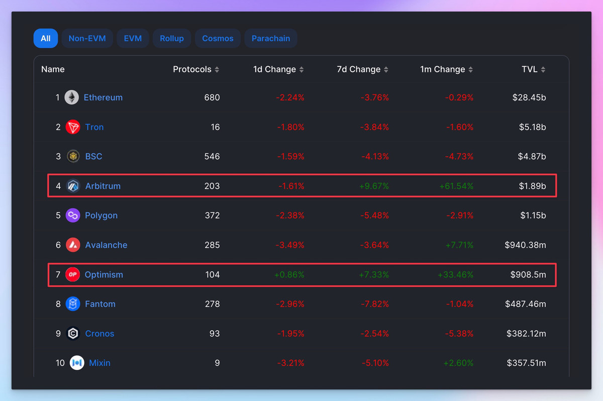 🔹 Chain TVL Growth หน้าเว็บ DeFiLlama: DeFi > Chains ดูที่ 7D & 1M ถ้าช่วงนี้ Arbitrum และ Optimism กำลังโตอยู่ ไม่น่าแปลกเพราะช่วงนี้ อาจเป็นช่วงบ้าเห่อ ETH Layer 2 ครับ