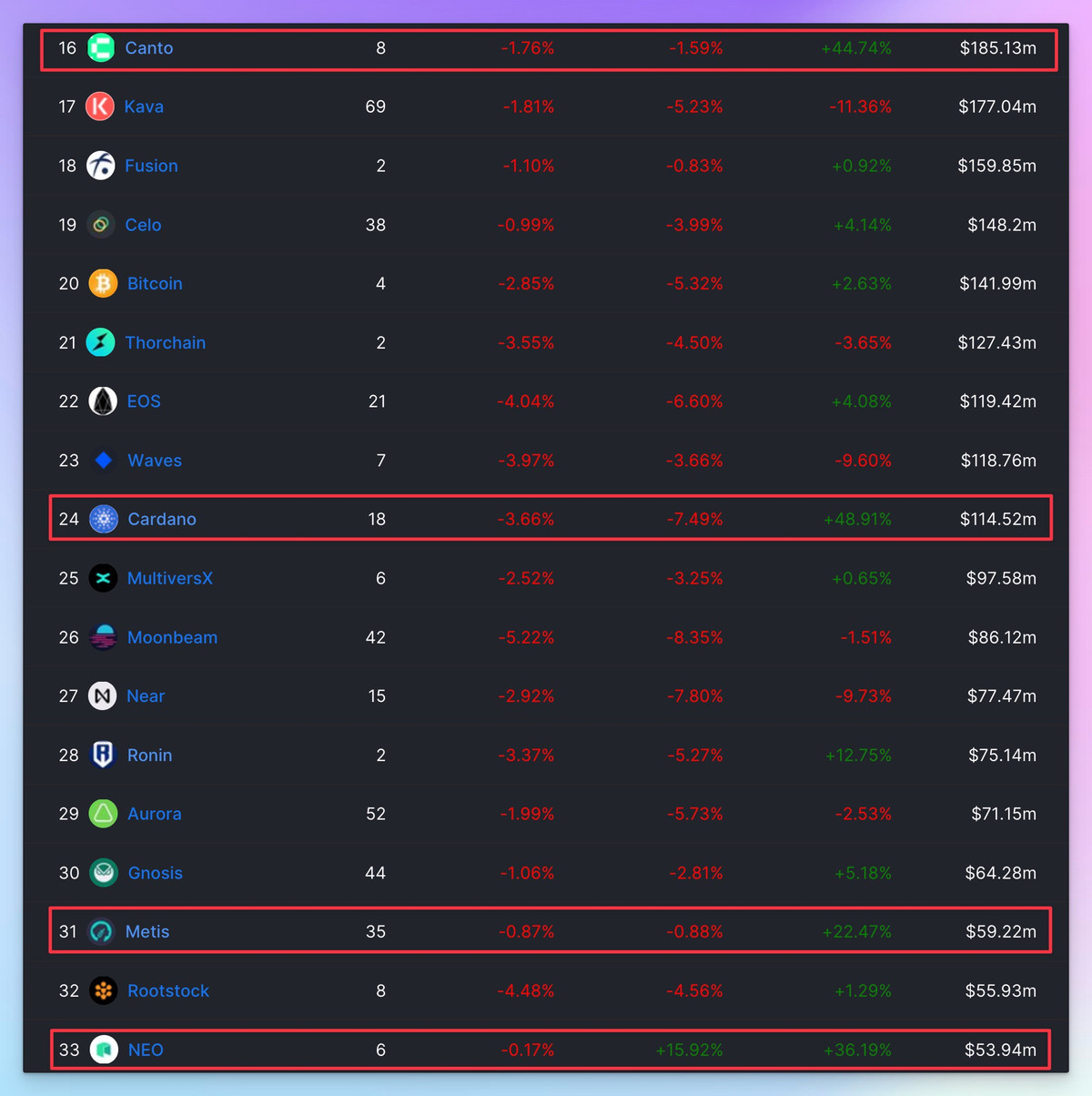 👉 วิธีจำจุด หาเงิน สไตล์เฮีย DeFi Edge แนะนำให้ เลือก Top 10 Chain แต่ถ้า คุณเป็นสายเสี่ยง สายล่าหวย ลองไปต่ำกว่านี้ก็ได้ ถ้าดู TVL growth แล้ว รอบ 1M จะเป็น Canto, Cardano, Metis, & NEO