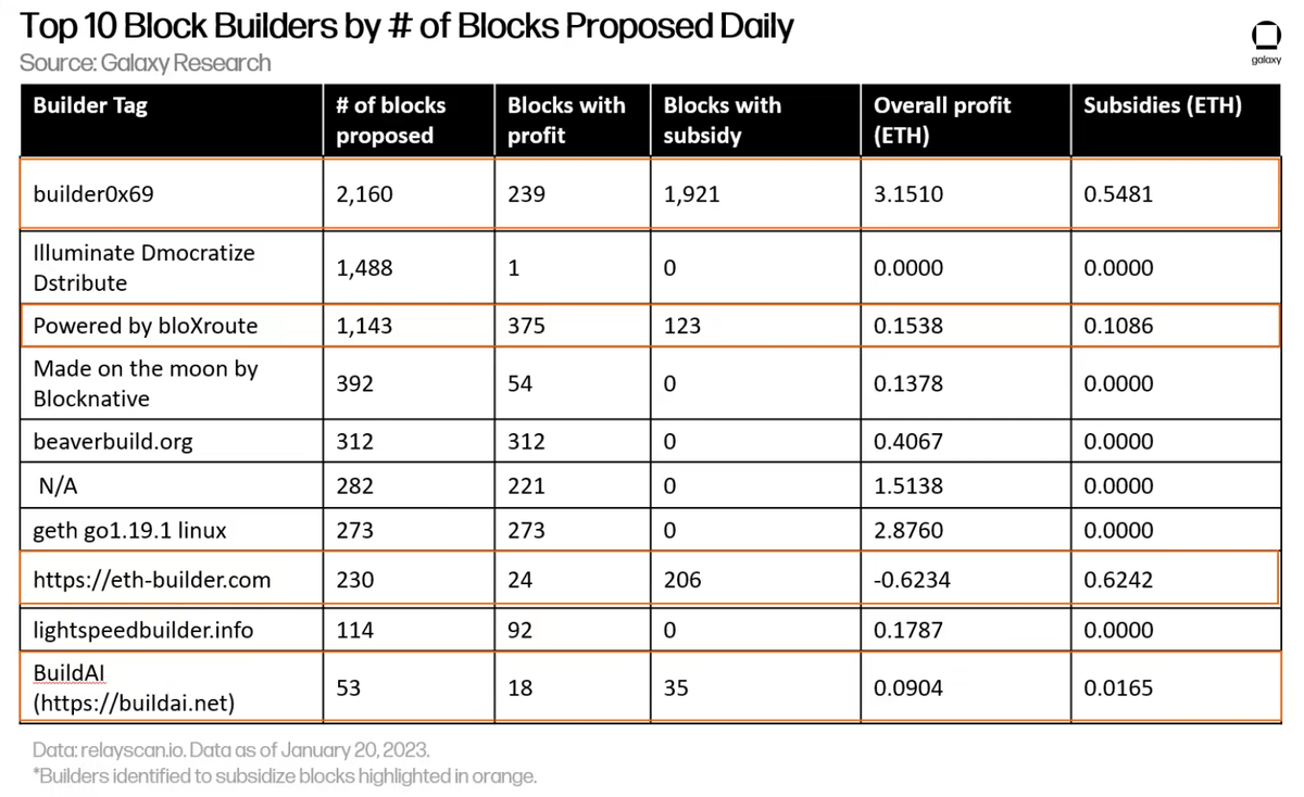 Galaxy's report dissects the MEV supply chain and highlights the top block builders by # of blocks, with builder0x69 coming in first place π₯.