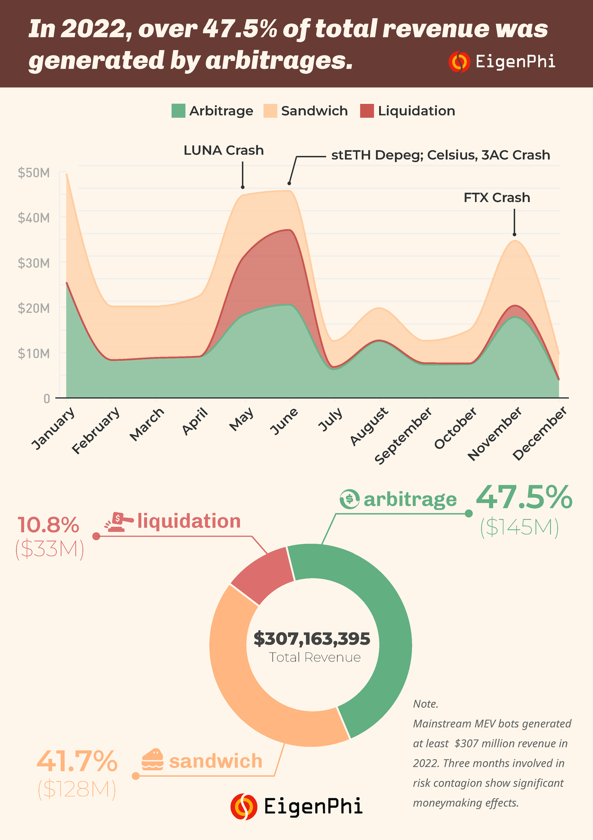 In general, EigenPhi found that arbitrage has generated more than $145 million in revenue, accounting for 47.5% of the total.