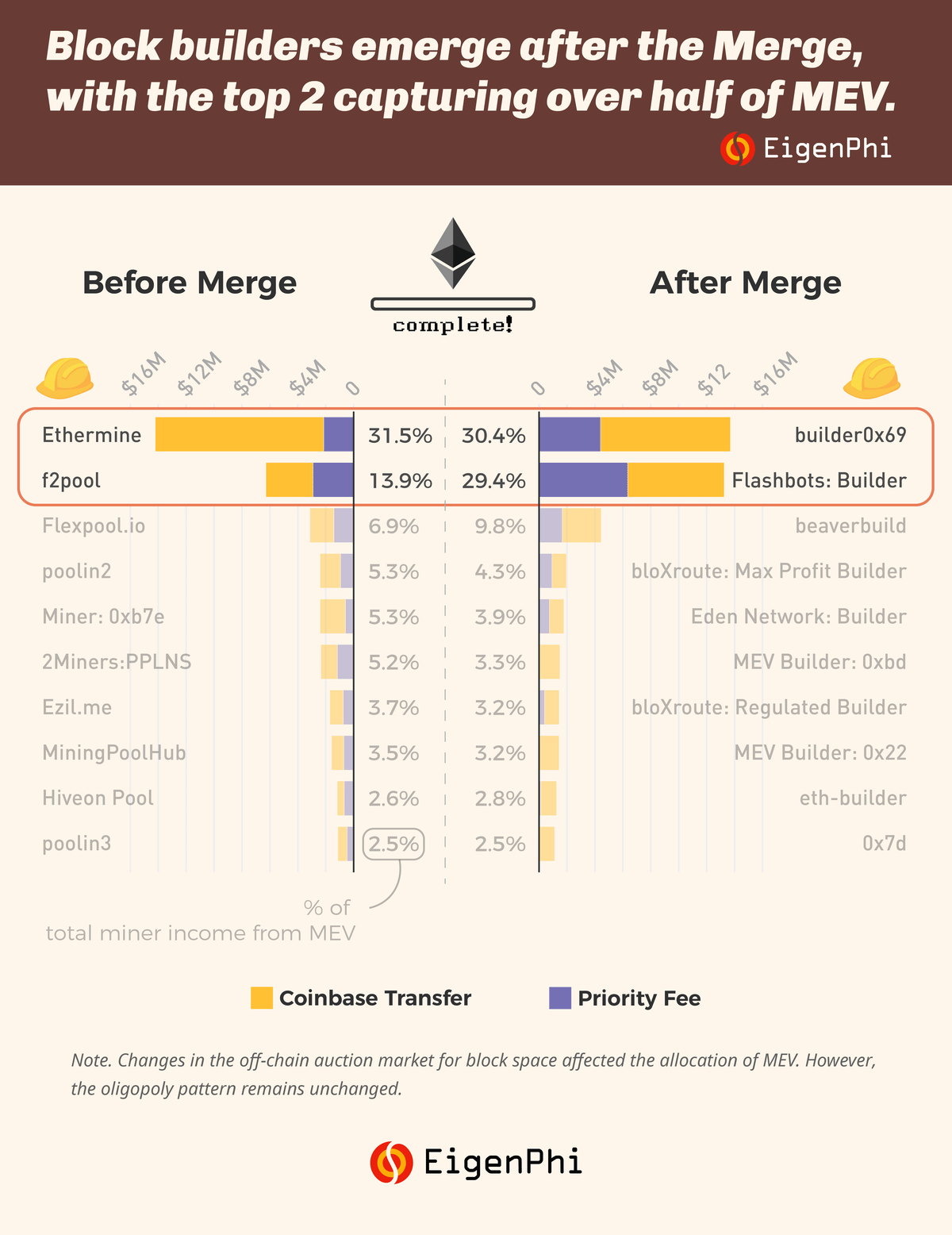 EigenPhi's data also shows that builder0x69 was one of the oligarchies, gaining more than 30% of total builder income.