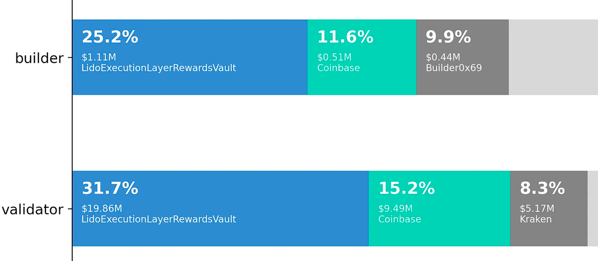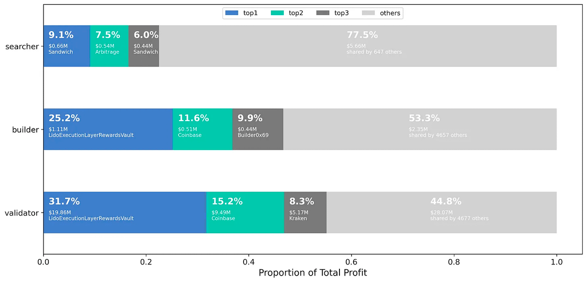 The market competition between builders and validators exhibits an apparent oligopoly effect, with @LidoFinance claiming a 30% market share, and the top three contenders, being builders and validators at the same time, securing about 50% of the total profits.