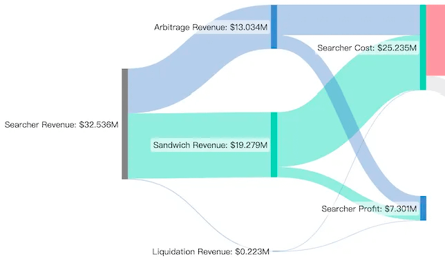 π€ $32.5M, that's searchers' revenue of #MEV on #Ethereum in Jan and Feb of 2023. In the same MEV supply chain, builders' income reached $67.21M, out of which validators took the most: $62.58M. This research shows you how the value flows thru the whole stream.
