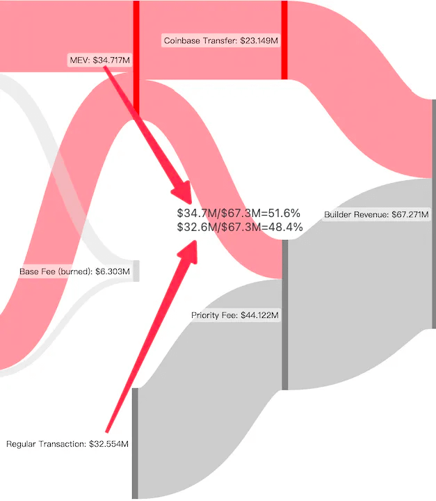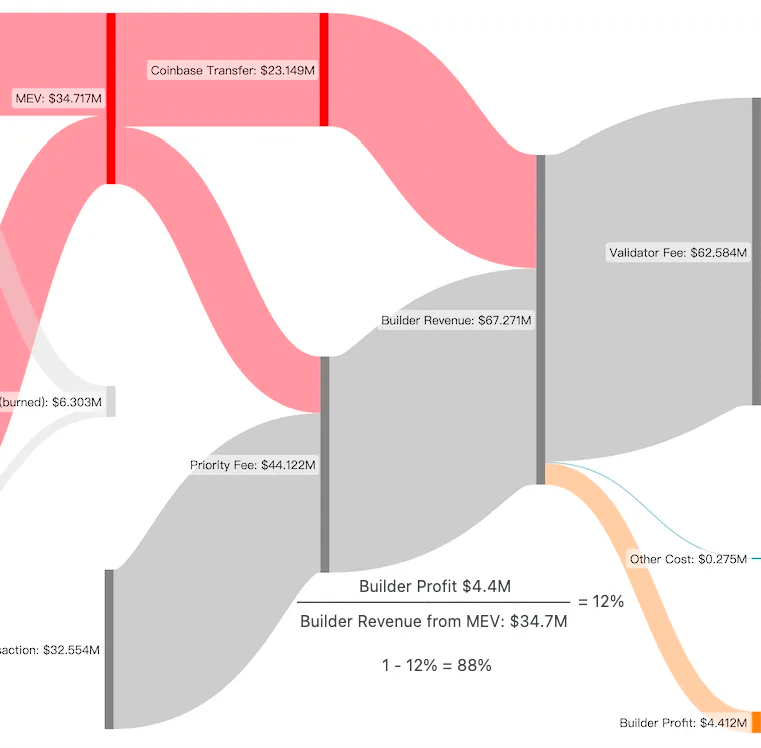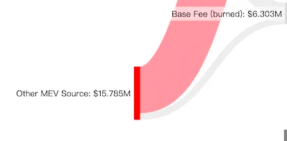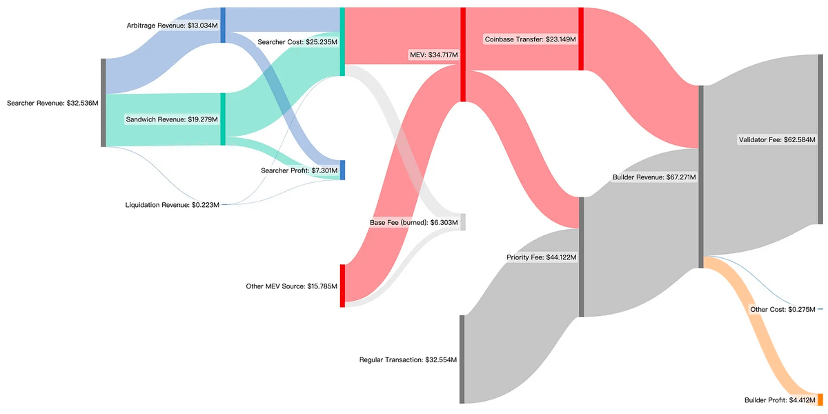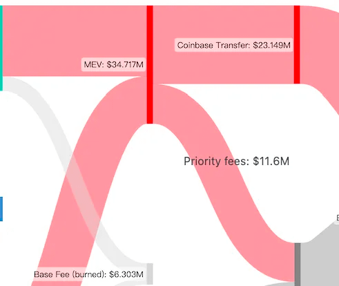 π· Of these MEVs, $23.1 million is directly transferred to the builder's address through coinbase.transfer(), while the remaining $11.6 million is paid to the builder as priority fees.