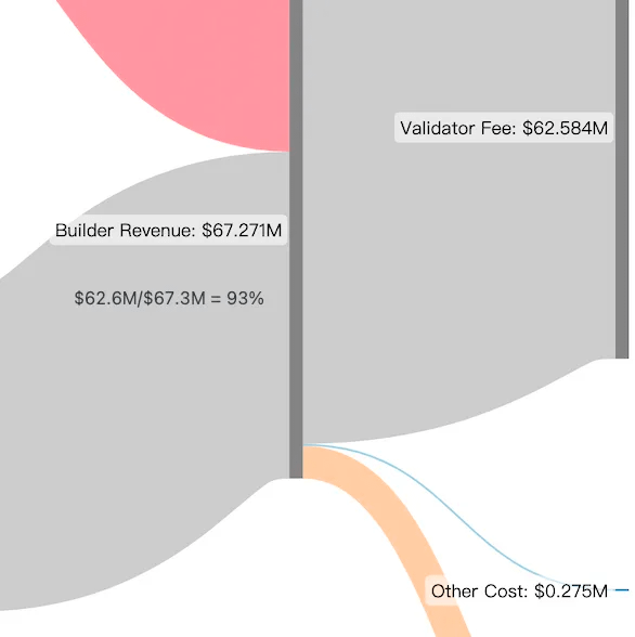 π Here is the big picture illustrating the benefits flow for different parties, specifically builders and validators under the current PBS scheme. One liner: MEV Accounts for 51.6% of Builders' Revenue, and Validators Stand as Top Beneficiaries.