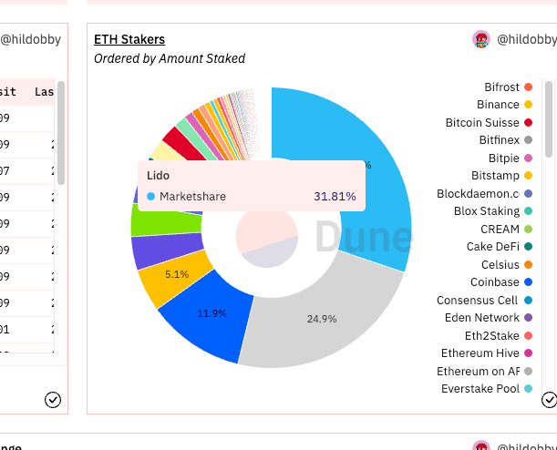 Lido's market share in terms of profits also aligns with its staking weight and the probability of proposing new blocks. @DuneAnalytics shows @LidoFinance has staked a total of 6,038,112 ETH with 189k validator nodes, accounting for 31.9%. dune.com/hildobby/eth2-staking