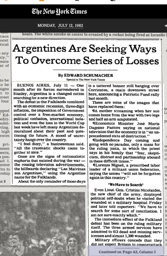 "One month after its forces surrendered in Stanley, Argentina is a changed nation searching for a new direction. Many Argentines are demoralized about their past and questioning the future."