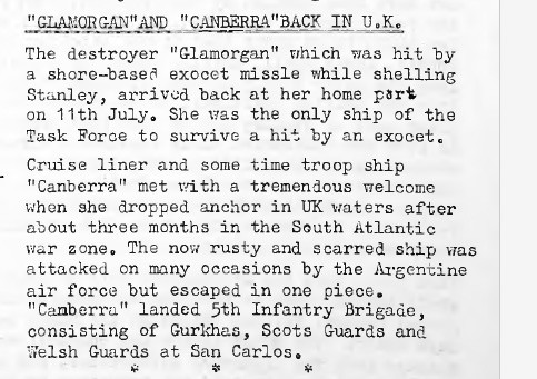 "Penguin News" reports that HMS Glamorgan and SS Canberra both arrived back to the UK on the 11th July. It is noted that Glamorgan was the only ship to have survived a hit from an exocet missile. Canberra is also praised for her role in the conflict.
