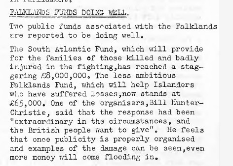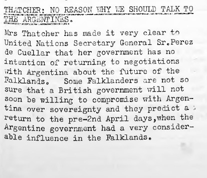 This hardline by Thatcher was picked up by the "Penguin News" and this view was clearly popular in Port Stanley.