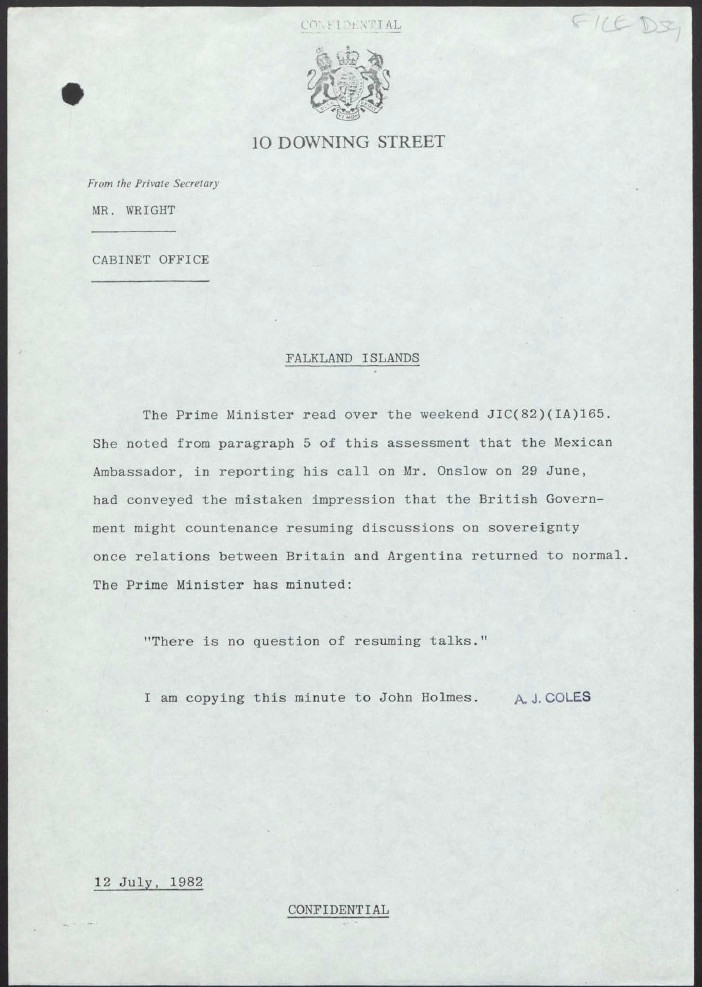 Cabinet office memo on the Falklands. Apparently the Mexican Government had the impression that the UK might be willing to reopen discussions with Argentina. That ship had sunk. The Prime Minister stated: