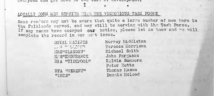 Finally from the "Penguin News" there is an acknowledgement that a large number of men born in the Falklands, served and may still be serving in the Task Force.