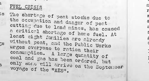 In the "Penguin News" it is reported that there is a severe shortage of peat stocks due to the occupation and the danger of peat cutting due to land mines. At least eight families are already without peat.