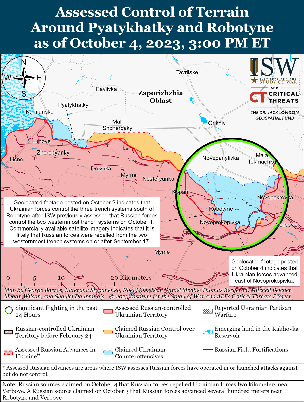Additional geolocated footage posted on October 4 confirms that Ukrainian forces hold positions near a trench system that lies along the T0408 Orikhiv-Tokmak route between Robotyne and Novoprokopivka.[55]