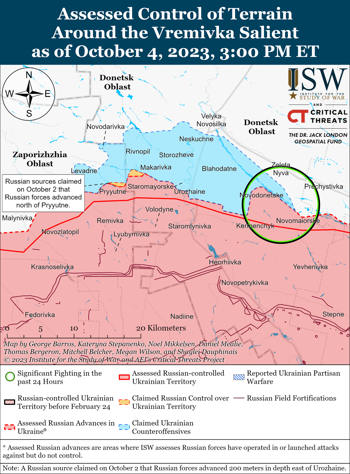 Russian forces conducted limited counterattacks in the Donetsk-Zaporizhia Oblast border area and reportedly regained some positions on October 4.