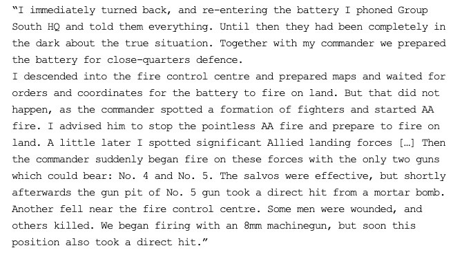 At least two accounts by SRS men say the battery fired only on ships, but an Italian report mentions the battery firing on approaching enemy troops, although it’s not clearwhich.