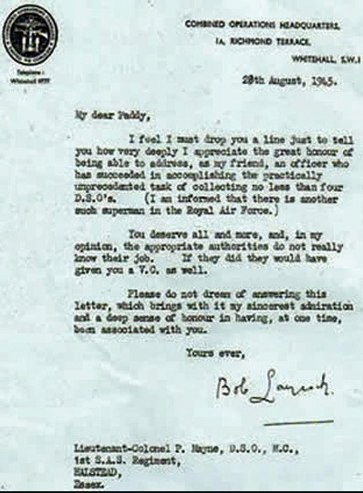 Her Majesty Queen Elizabeth's uncle, Major General Sir Robert Laycock, who, at the time, was Chief of Combined Operations, wrote a letter in which he stated that Blair Mayne deserved a Victoria Cross and would have received one had the proper authorities known their job.