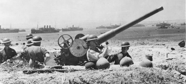 British troops man one of the captured 76mm guns in AS 309. In the background, Allied shipping fills Syracuse’s harbour. Source: NARA