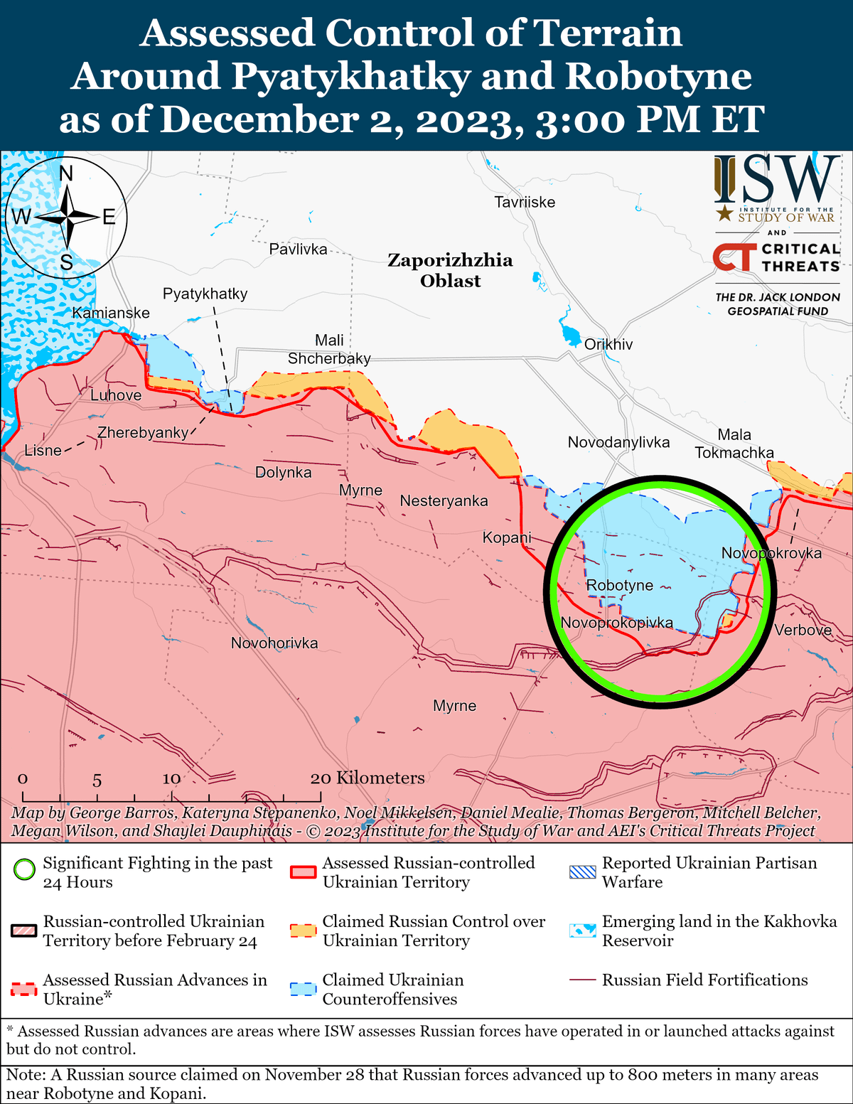 Russian forces continued to counterattack Ukrainian positions in western Zaporzihia Oblast on December 2 and reportedly made an unconfirmed advance near Robotyne.