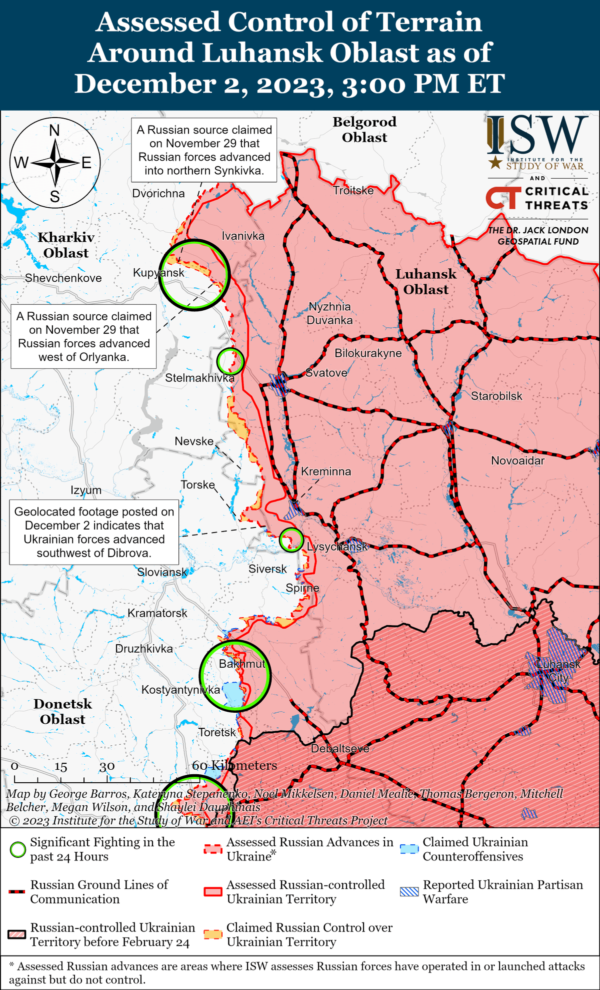 Russian forces continued localized offensive operations along the Kupyansk-Svatove-Kreminna line on December 2 but did not make any confirmed advances.