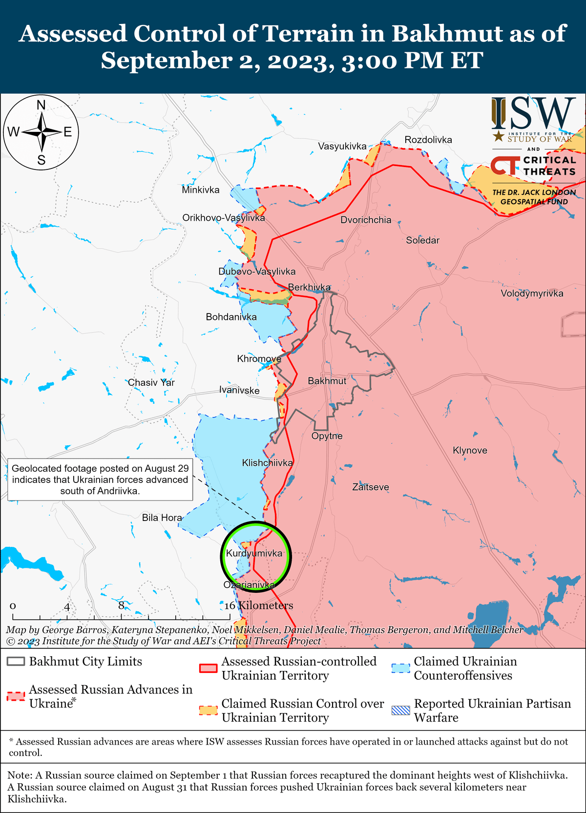 Ukrainian forces conducted offensive operations near Bakhmut on September 2 and advanced. Geolocated footage published on September 2 indicates that Ukrainian forces have advanced near Klishchiivka, although these gains are likely not recent.[26]