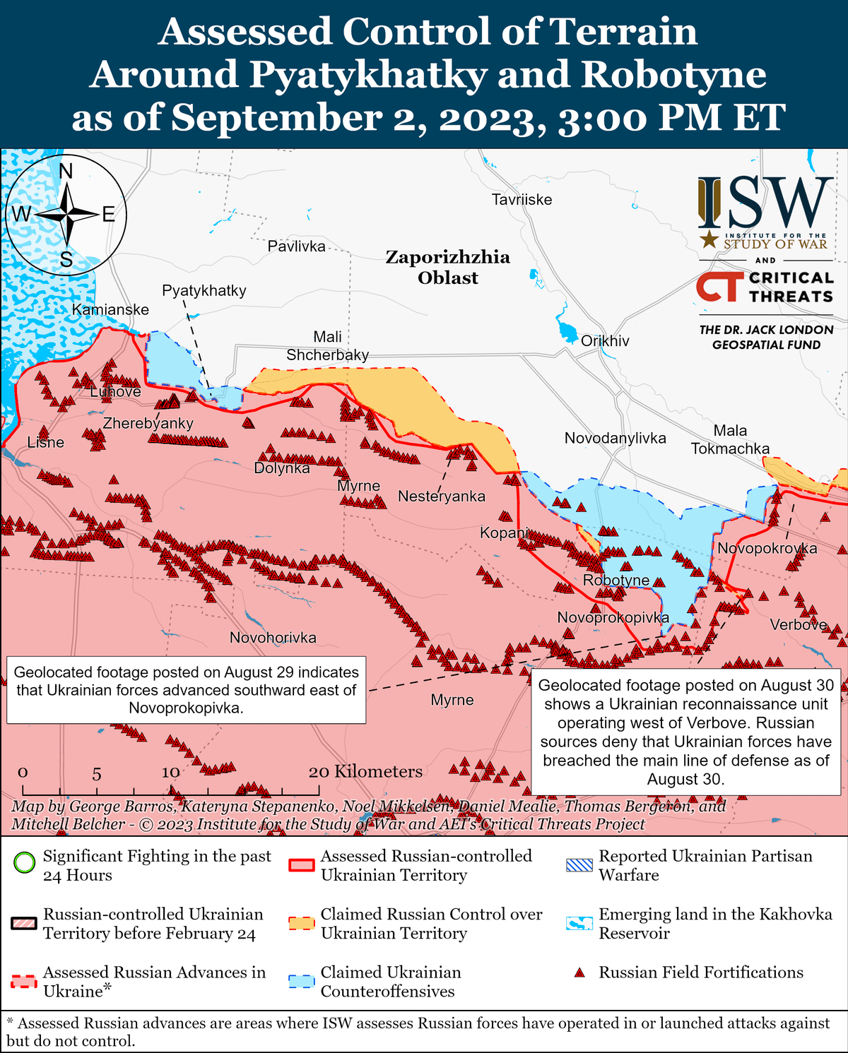 Russian sources claimed that Russian forces counterattacked in western Zaporizhia Oblast on September 2 but did not specify an outcome. A Russian milblogger claimed that Russian forces conducted a series of counterattacks southwest and south of Robotyne.[48]