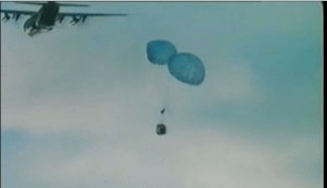 HMS Andromeda had sailed to recover the stores dropped by the long range Hercules who on this occasion dropped the containers a little too close to the warship. Twenty two passengers also arrived by parachute and were picked up without incident.