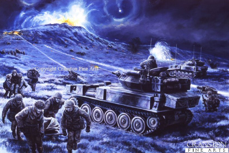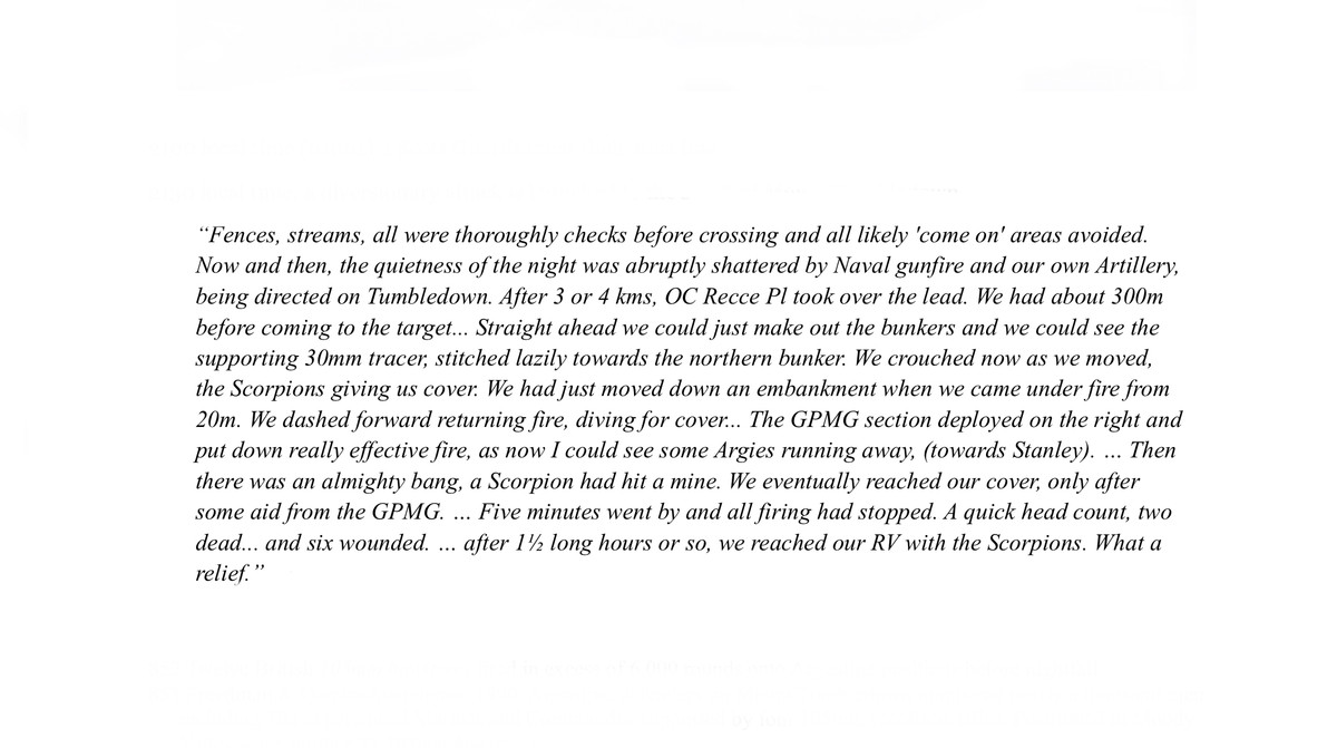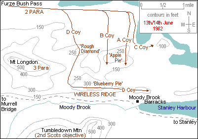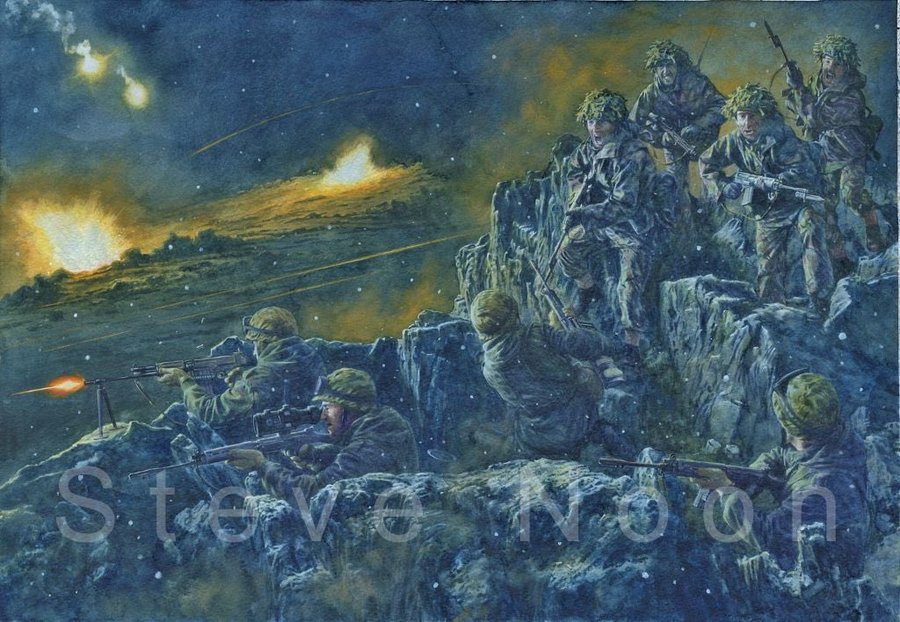 After 2 Para had finished marching that Sunday evening (13th) from Furze Bush Pass, supporting fire was opened on 'Rough Diamond' at 9.15 pm, and 30 minutes later, D Coy crossed its start line backed up by the fire of four Scimitars & Scorpions.