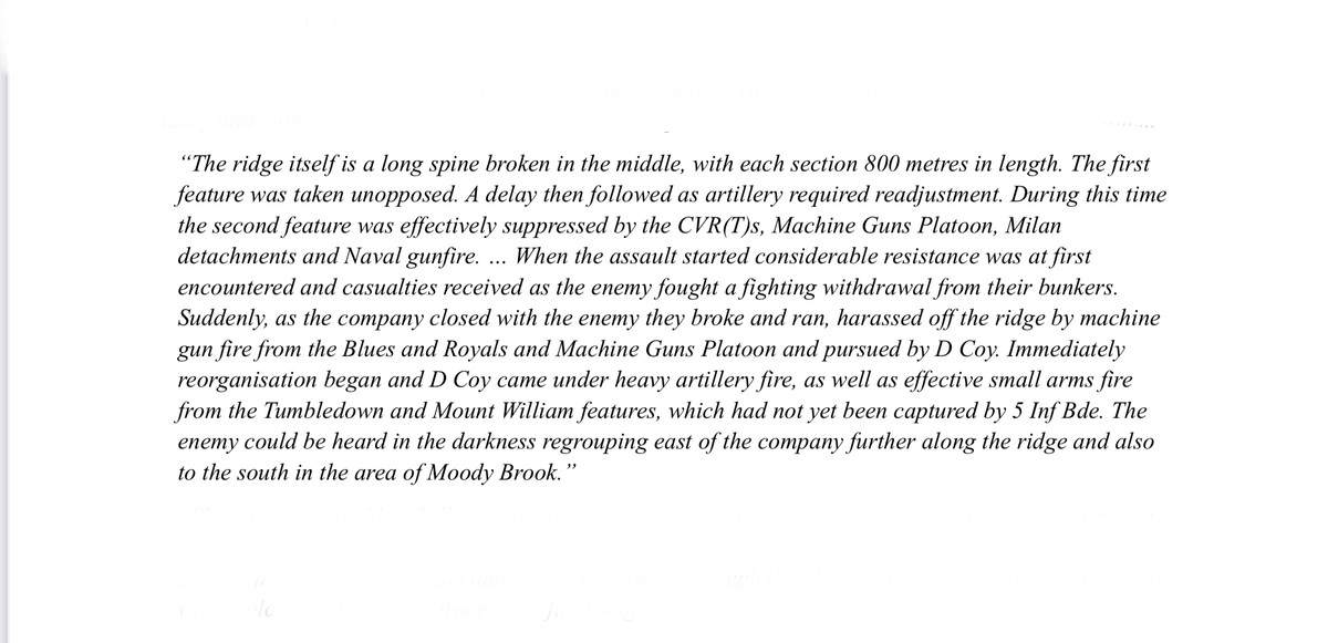 From 'Rough Diamond', D Coy moved to the western end of Wireless Ridge and prepared to advance through its length, as the light tanks and supporting Milans and GPMG's joined A and B Coys on 'Apple Pie' pouring in fire from the left flank.
