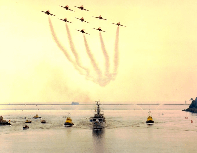 With Yarmouth, she was one of only two escorts of the first group undamaged. She had a close shave from the San Luis torpedo & her hull had suffered from the ravages of the weather. She returned to Devonport on 7th July 1982 to a heroes reception.