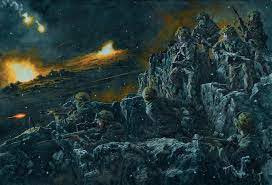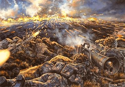 At a crucial moment, a base plate began to slip on the rocky slope. One after another, four soldiers stood on the baseplate as the vital rounds were fired knowing as they did so that one after another their ankles were broken by the recoil shock.
