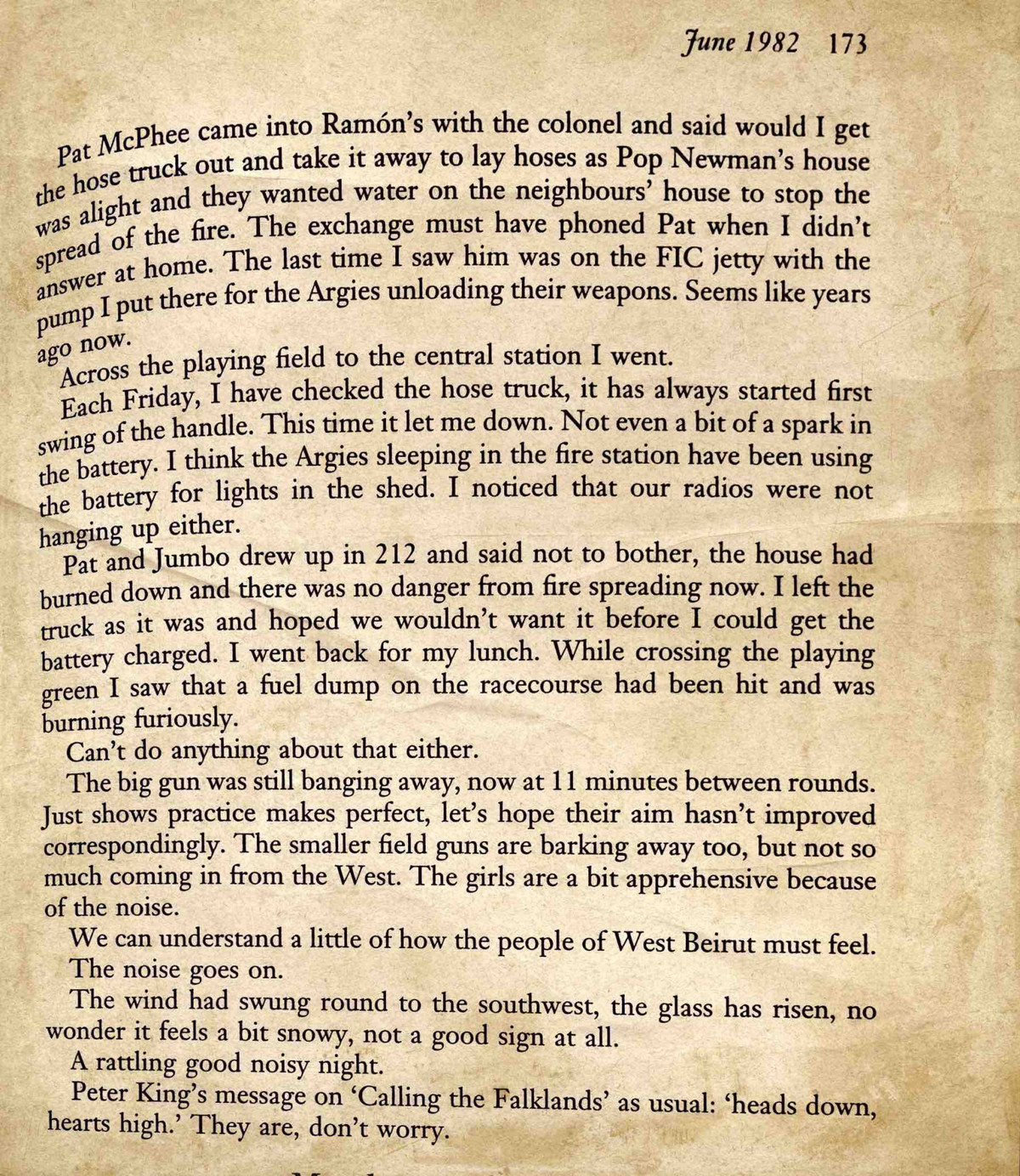 “About 11.30 this morning Wilfred Newman’s house on Davis Street received a direct hit and burned quickly in a great mass of smoke and flames. British are obviously trying to hit the Argentine 155mm that is between the houses up there.” Smith '84