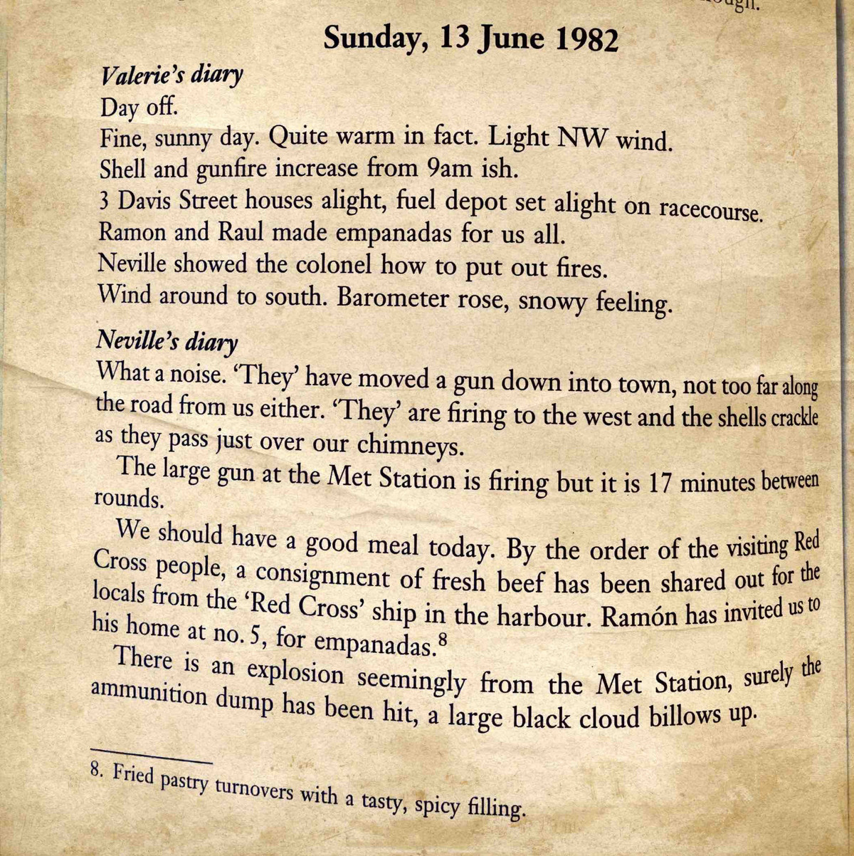 “Sleep was impossible: shells screaming and tearing overhead, the bursts rocking the house every few seconds; deafening noise from the Argentine guns – loud twanging cracks"
