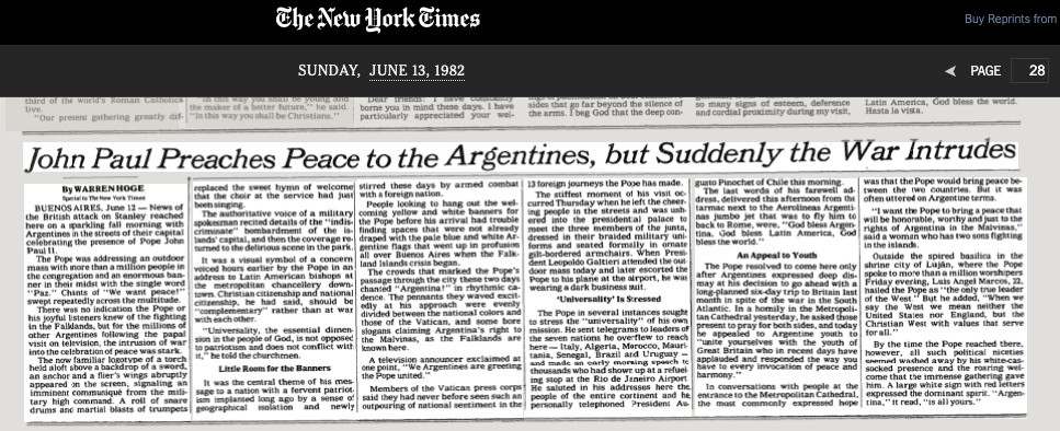 New York Times reports that as the Pope addressed an outdoor mass to a million worshipers, chants of ''We want peace!'' swept repeatedly across the multitude. However for those watching on TV bad news about war replaced "El Papa".