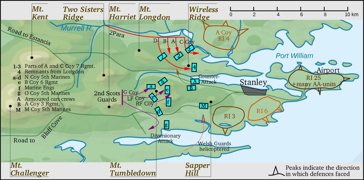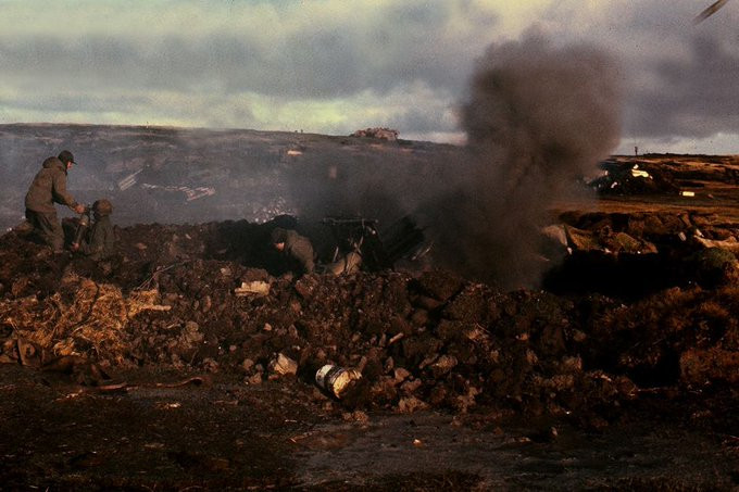 The battles will rage until morning. On Wireless Ridge, 2 Para start gaining ground steadily, knocking out one bunker after another, as on Tumbledown, the two sides blast at each other throughout the night at point blank range...