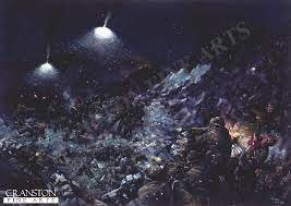 The Argentine flares hung in the air, and in their stark light shell after shell lobbed among the Guards as they walked steadily forwards to the lower slopes and on up the steep sides.
