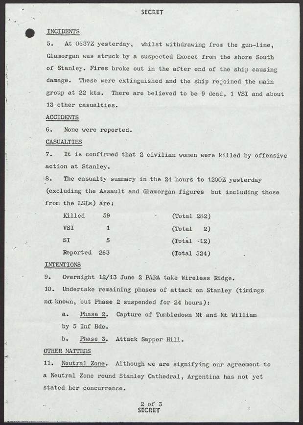 “What a noise.... A rattling good noisy night. Peter King's message on 'Calling the Falklands' as usual: 'heads down, hearts high.' They are, don't worry.” Neville Bennett's diary.