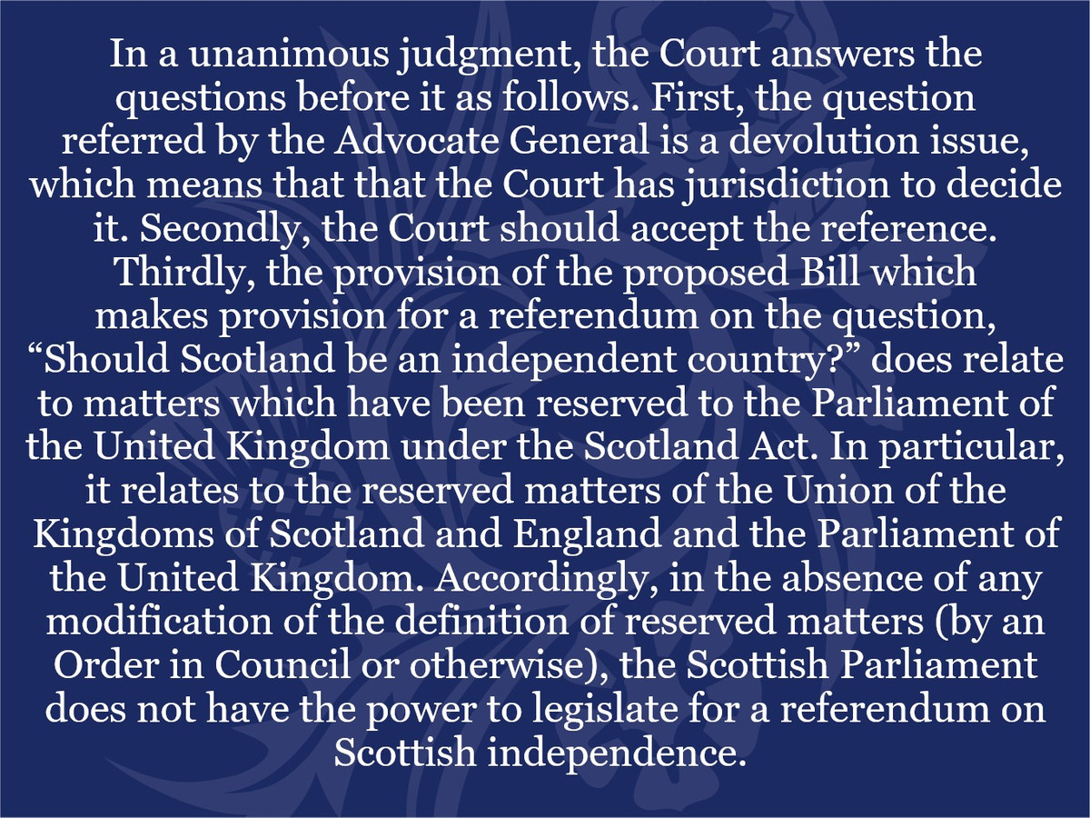 Lord Reed pointed out the fact that Scotland is neither a former colony nor an oppressed nation, and so the SNP’s argument in the case, that its self-determination was a right under international law, was not valid.