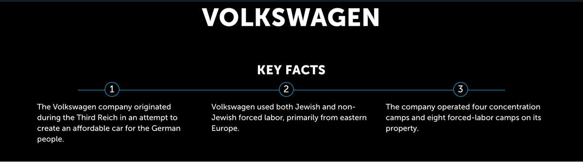 The company has, in many ways, been at the forefront of the program for reparations from German corporations. An example of its transparency is the presence on its website of a candid catalog from the Volkswagen’s museum exhibit on its behavior during the Third Reich.