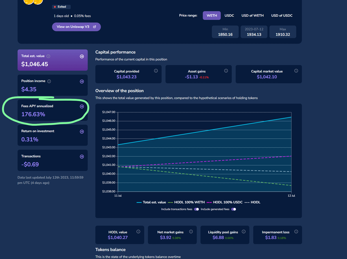 Now on to the results. I have rebalanced an $ETH $USDC LP 10 times in the span of a week (very active for me) while generating HIGH yields CONSISTENTLY on $ETH $USDC liquidity pools while MINIMIZING Impermanent Loss to make it a non-factor! Shout out to @ApyVision for tracking!